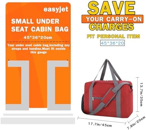 Perect Size to Save Your Carry on Charges:The duffle bag come with good size: 45x35x20cm(capacity of 30L), which fits 45x36x20cm of Easyjet Airlines, British Airlines, Emirates, Virgin Atlantic perfectly. This bag can fit under the seat, helping you avoid excess luggage fees.