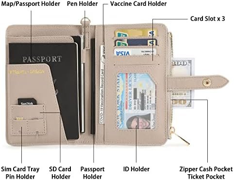 3.Snap Button Closure: 2 Passport Pocket, 5 Card Slots, 1 ID Holder, 1 Pen Holder, 3 SIM/PIN slots and 1 Zipper Pocket.