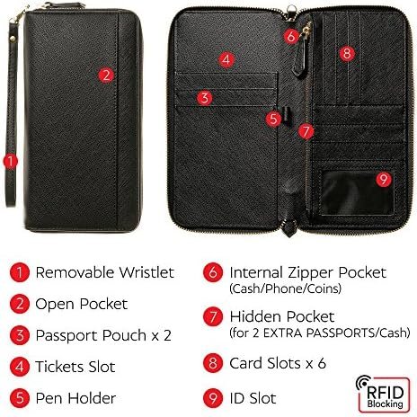 GREAT SIZE – fits multiple passports (up to 4), tickets, money, travel documents, 6+ credit cards, pen, ID card or driver’s license, phone. Excellent for solo trip or trip with kids and family