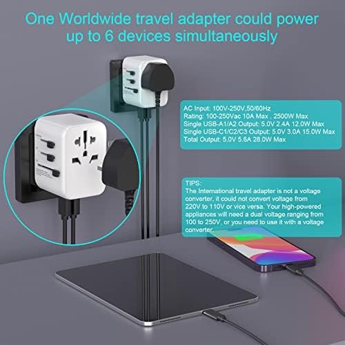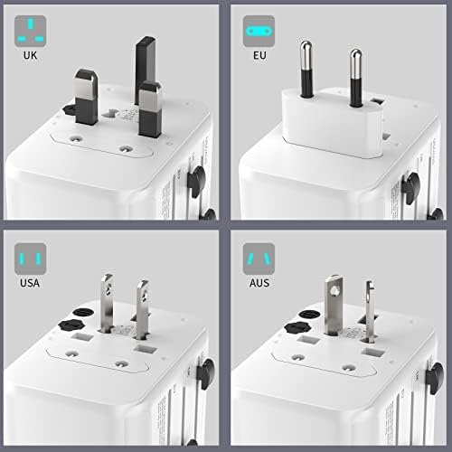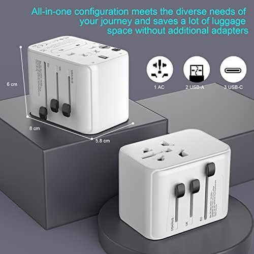 One universal travel adapter comes with UK / EU / USA / AU plug socket, 2 USB A and 3 USB C ports, you could expand 1 outlet to 1 worldwide AC outlet and 5 USB charging ports which means it could power up to 6 devices simultaneously. The USB C travel adapter can provide the fastest current up to 3A, faster than ordinary USB multiple plugs, and saves you time.