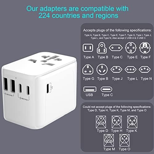 【All In One International Travel Adapter】Diswoe travel adapter comes with 2 USB A and 3 USB C ports and also accepts plugs of the following specifications: Type A, Type B, Type C, Type E, Type F, Type G, Type I, Type J, Type L, and Type N. The USB slots can detect multiple devices and distribute current dynamically with a maximum total output of 28W. When you are on holiday, it can charge your and your travel companions’ devices overnight in various hotel rooms and on trains.